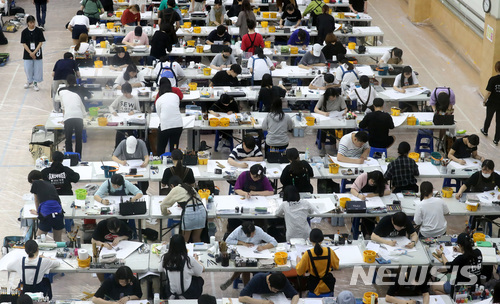【서울=뉴시스】이영환 기자 = 21일 오전 서울 노원구 삼육대학교 체육관에서 열린 전국 고교생 디자인·미술 실기대회에 참가한 학생들이 그림을 그리고 있다.