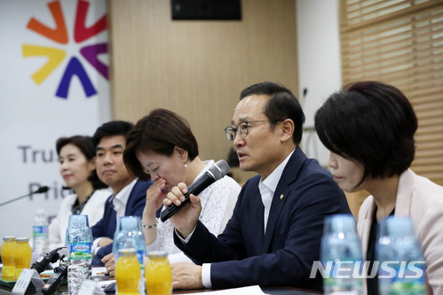 【성남=뉴시스】홍효식 기자 = 더불어민주당 홍영표 원내대표가 6일 오후 경기 성남시 중원구 아이에스시(반도체 테스트 소켓생산기업) 회의실에서 열린 일자리 현장 정책 간담회에 참석해 모두발언을 하고 있다. 오른쪽부터 한정애 소득주도성장팀장, 홍영표 원내대표, 진선미 원내수석부대표, 김병욱 의원, 박경미 원내대변인. 2018.07.06.