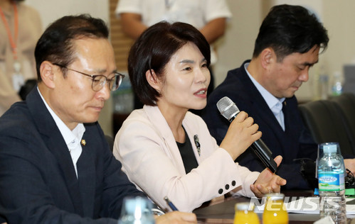 【성남=뉴시스】홍효식 기자 = 더불어민주당 한정애 소득주도성장팀장이 6일 오후 경기 성남시 중원구 아이에스시(반도체 테스트 소켓생산기업) 회의실에서 열린 일자리 현장 정책 간담회에 참석해 모두발언을 하고 있다. 왼쪽부터 홍영표 원내대표, 한정애 소득주도성장팀장, 김종민 소득주도성장팀 간사. 2018.07.06.