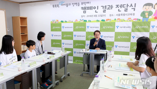【서울=뉴시스】박주성 기자 = 22일 오전 서울 종로구 서울시교육청에서 열린 굿네이버스 아동권리정책제안캠페인 '똑똑똑, 우리동네 아이들의 정책을 부탁해' 결과 전달식에서 조희연 교육감이 참석해 인사말을 하고 있다.