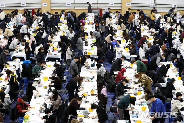 【서울=뉴시스】김병문 수습기자 = 8일 오전 서울 노원구 삼육대학교 체육관에서 치러진 2019학년도 정시모집 미술 실기고사에서 아트앤디자인학과 수험생들이 실기를 보고 있다.