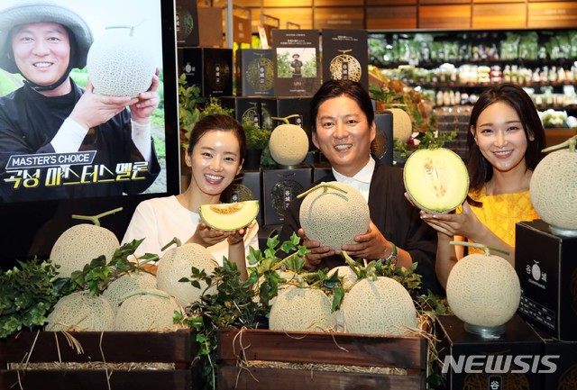 【서울=뉴시스】12일 서울 SSG푸드마켓 청담점에서 강레오 셰프와 모델들이 신품종 명품 멜론인 '마스터스 초이스 멜론'을 소개하고 있다.