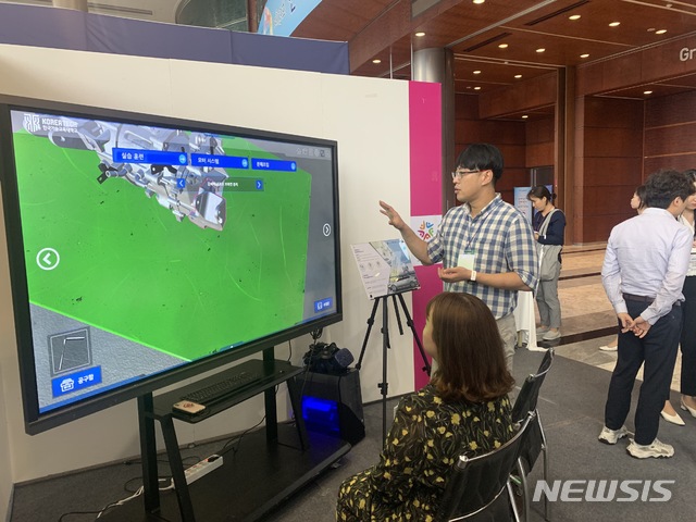 【천안=뉴시스】이종익 기자 = 충남 천안의 코리아텍 온라인평생교육원이 10일 오전 서울 코엑스에서 열린 한국산업인력공단이 주관한 '2019년 인적자원개발 컨퍼런스'에서 가상현실(VR) 등 4차 산업관련 신기술과 관련해 전기자동차 구동장치 장비를 선보이고 있다. 2019.09.10. (사진=코리아텍 제공)