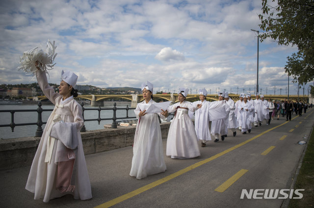 【부다페스트=AP/뉴시스】7일(현지시간) 헝가리 부다페스트를 찾은 한국 공연단이 유람선 '허블레아니' 희생자 들을 추모하며 다뉴브강 주변을 지나고 있다.