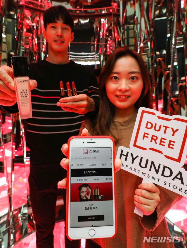 【서울=뉴시스】팝업스토어 모델들이 28일 서울 강남구 삼성동 코엑스 케이팝(K-POP) 광장의 '랑콤 팝업스토어'에서 랑콤 신제품 '압솔뤼 루비 크림 립스틱'과 현대백화점 면세점을 소개하고 있다. 현대백화점 면세점은 다음달 3일까지 '랑콤'과 협업해 케이팝 광장에서 42m 길이의 대형 팝업스토어를 운영한다. 2019.10.28 (사진=현대백화점그룹 제공)