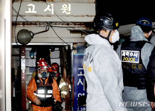 [서울=뉴시스]김병문 기자 = 과학수사대와 화재조사반 관계자들이 31일 오후 서울 구로구의 한 상가 건물 2층에 있는 고시원 화재현장을 조사하고 있다. 소방당국은 이날 오후 4시45분께 서울 구로구의 한 상가 건물 2층에 있는 고시원에서 검은 연기가 나온다는 신고를 받고 출동, 약 40분 만인 오후 5시22분께 초진에 성공했다고 밝혔다. 2020.01.31.