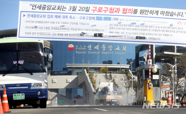 [서울=뉴시스] 조수정 기자 = 신종 코로나 바이러스 감염증(코로나19) 집단 감염으로 인한 지역사회 확산을 막기 위해 정부가 종교 행사 및 집회 중단을 권고했음에도 불구하고 22일 오전 예배를 강행한 서울 구로구 연세중앙교회 앞에서 교회 관계자들이 방역을 하고 있다. 연세중앙교회 관계자는 이날 정문 앞에서 취재중인 기자들에게 보도자료를 배포하며 성도들에게 최대한 온라인 예배를 부탁하고 있으며 성전에서는 출입 성도간 2미터 간격을 유지하는 등 코로나19 확산 방지에 최선을 다하고 있다고 밝혔다. 사회적 거리 유지하기, 마스크 착용 의무화, 발열 체크, 소독, 교회내 방역, 교회 내 음식 섭취 금지 등 국가가 장려하는 7가지 감염예방 수칙을 철저히 준수하고 있으며 해외 혹은 대구 경북 지역 방문, 확진자 접촉 등을 한 사람들과 고위험군(65세 이상, 임산부, 미취학 아동, 장애인, 기저질환자)은 교회 코로나19 대책위원회에 자가격리 보고서를 제출하고 30일간 자가격리 하며 온라인 예배를 하고 있다고도 전했다. 2020.03.22.