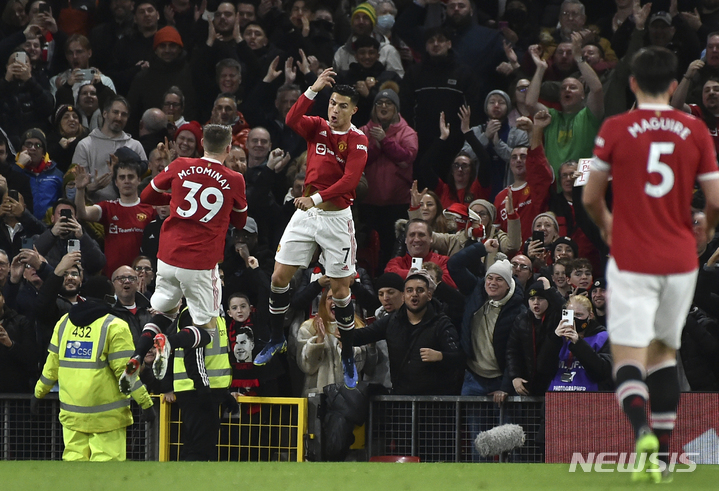 [맨체스터=AP/뉴시스] 맨체스터 유나이티드의 크리스티아누 호날두(가운데)가 30일(현지시간) 영국 맨체스터의 올드 트래퍼드에서 열린 2021-22 잉글랜드 프로축구 프리미어리그(EPL) 20라운드 번리와의 경기 전반 35분 팀의 세 번째 골을 넣고 환호하고 있다. 호날두는 1골 1도움을 기록하며 팀의 3-1 승리를 이끌었고 맨유는 6위로 올라섰다. 2021.12.31.