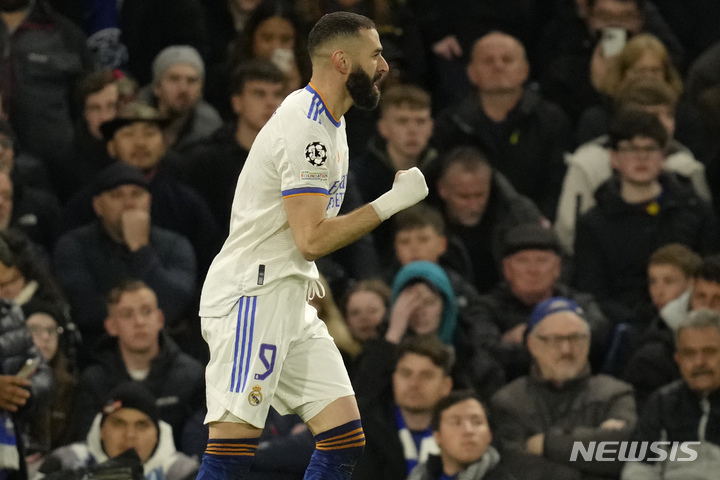 [런던=AP/뉴시스] 레알 마드리드(스페인)의 카림 벤제마가 6일(현지시간) 영국 런던의 스탬퍼드 브리지에서 열린 첼시(영국)와의 2021~22 유럽축구연맹(UEFA) 챔피언스리그(UCL) 8강 1차전 후반 1분 해트트릭을 완성한 후 기뻐하고 있다. 레알은 벤제마의 UCL 2경기 연속 해트트릭에 힘입어 첼시를 3-1로 물리쳤다. 2022.04.07.