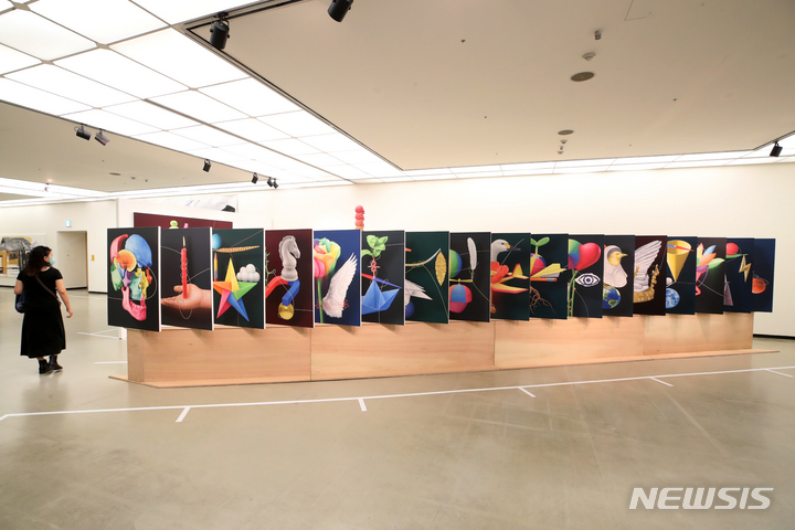 [서울=뉴시스] 박진희 기자 = 아이프앤코와 호리아트스페이스가 공동 주최한 오픈 스튜디오형 아트페스트 '그림의 탄생' 전시가 열린 30일 서울 서초구 한가람미술관에 국내 작가 12인의 작품이 전시되고 있다. 이번 전시는 이건용, 서용선, 오원배, 민병훈, 김남표, 변웅필, 윤종석, 송필, 강준영, 박경률, 박효빈, 유현경 작가가 참여했다.  2022.09.30. [email protected]