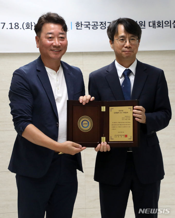 [서울=뉴시스] 김선웅 기자 = 이종석(왼쪽) 물과소금 대표이사가 18일 서울 중구 한국공정거래조정원에서 열린 2023년 상생협력 우수 가맹본부 선정식에서 최영근 한국공정거래조정원장에게 우수 가맹본부 선정서와 상패를 받고 있다. 한국공정거래조정원은 이날 모범적인 상생협력 사례를 보여준 6개 가맹본부를 2023년 상생협력 우수 가맹본부로 선정하고 상패를 수여했다. 수유리우동집을 운영하는 물과소금은 가맹점에 가맹비와 홍보비 및 노무서비스 지원을 제공하고 자체 원재료 공장을 설립해 원가, 인건비 절감을 추진했다. 2023.07.18. [email protected]