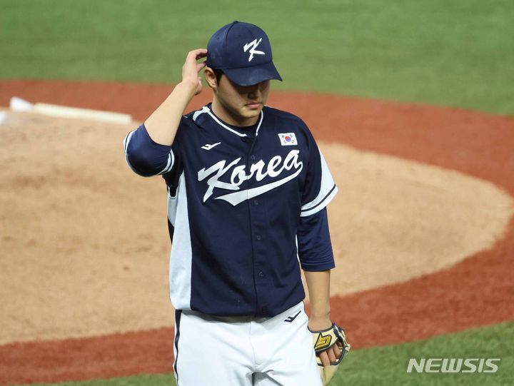 [사오싱=뉴시스] 조수정 기자 = 2일 중국 저장성 사오싱 1야구장에서 열린 2022 항저우 아시안게임 야구 B조 조별리그 2차전 대한민국 대 대만 경기에 앞서, 한국 선발투수 문동주가 1회말 2사 대만 린안커 타석 때 3루주자 쩡종저를 홈으로 들여보내며 한점을 허용, 이닝을 마친 뒤 아쉬워하며 덕아웃으로 향하고 있다. 2023.10.02. [email protected]