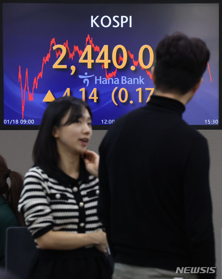 [서울=뉴시스] 황준선 기자 = 18일 코스피가 전 거래일(2435.90)보다 4.14포인트(0.17%) 상승한 2440.04에 장을 닫았다. 코스닥지수는 전 거래일(833.05)보다 7.28포인트(0.87%) 오른 840.33에 거래를 종료했다. 원·달러 환율은 전 거래일(1344.2원)보다 4.5원 내린 1339.7원에 마감했다. 이날 오후 서울 중구 하나은행 딜링룸 전광판에 지수가 표시돼 있다. 2024.01.18. [email protected]