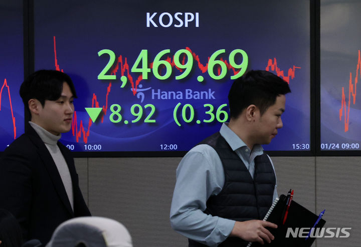 [서울=뉴시스] 조성우 기자 = 코스피가 전 거래일(2478.61)보다 8.92포인트(0.36%) 내린 2469.69에 장을 장을 마감한 11일 오후 서울 중구 하나은행 딜링룸에서 딜러들이 업무를 보고 있다. 코스닥지수는 전 거래일(840.11)보다 3.90포인트(0.46%) 하락한 836.21에 거래를 종료했다. 원·달러 환율은 전 거래일(1333.4원)보다 3.6원 오른 1337.0원에 마감했다. 2024.01.24. [email protected]