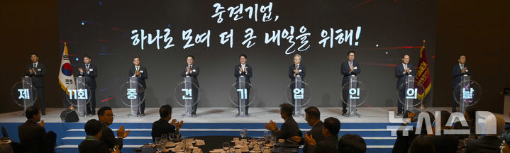 [서울=뉴시스] 청사사진기자단 = 김민석 국무총리가 1일 오전 서울 중구 롯데호텔에서 열린 제11회 중견기업인의 날 기념식에서 내외빈과 함께 퍼포먼스를 하고 있다.