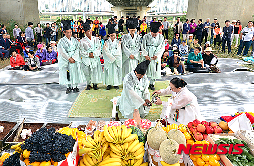 【서울=뉴시스】전진환 기자 = 밤섬 실향민 고향 방문 행사가 열린 12일 오전 서울 마포구 밤섬에서 실향민과 지역주민들이 귀향제를 지내고 있다.