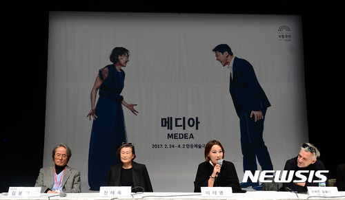 【서울=뉴시스】조성봉 기자 = 13일 오전 서울 용산구 국립근단 백성희장민호극장에서 열린 연극 '메디아' 기자간담회에서 배우 이혜영(왼쪽 세 번째)이 취재진의 질문에 답변하고 있다. 왼쪽부터 김윤철 예술감독, 진태옥 의상디자이너 , 배우 이혜영, 연출 로버트 알폴디.