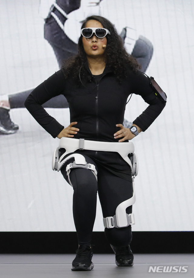 [라스베이거스=AP/뉴시스]6일(현지시간) CES 2020 개막을 하루 앞두고 미 네바다주 라스베이거스 베네치안 호텔에서 열린 CES 기조연설에서 한 여성이 웨어러블 보행 보조 로봇 ‘젬스(GEMS: Gait Enhancing & Motivating System)’와 ‘AR 글래스’를 시연하고 있다. GEMS는 가상의 개인 트레이너에게 피트니스를 받으며 실시간으로 자세 교정을 받고, 운동 결과는 모바일 기기를 통해 피드백 받는다. 세계 최대 가전·IT 전시회 'CES 2020'은 7일 개막한다. 2020.01.07.