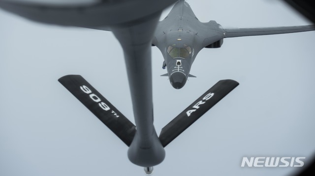 [서울=뉴시스]미국 공군 B-1B 전략폭격기가 지난 27일 일본 근해에서 미일 연합훈련중 일본 오키나와 가데나 공군기지 소속 KC-135 공중급유기로부터 급유를 받고 있다. 미일 연합훈련중 일본서 출발한 특수작전용 수직이착륙기 CV-22B가 경북 포항 인근 동해상을 이례적인 비행을 했다. (사진=미 공군 홈페이지 캡쳐) 2020.07.29.