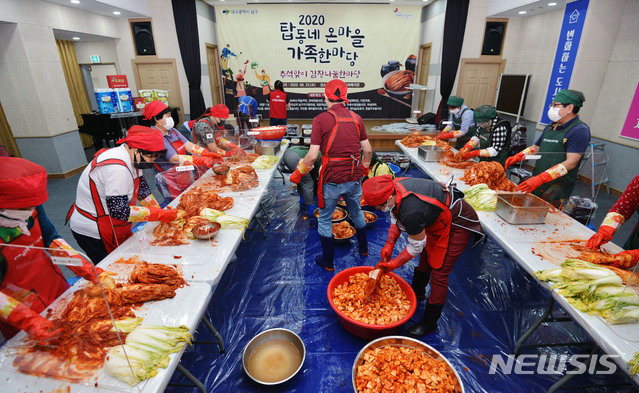 [대구=뉴시스] 이무열 기자 = 추석맞이 가을 김장 나눔 행사가 열린 23일 오후 대구 남구종합사회복지관에서 봉사자 20여명이 마스크 착용, 칸막이 설치 등 방역 수칙을 준수하며 소외계층에 전달할 김치를 담그고 있다. 복지관은 지난해 700명이 참석하는 대규모 김장 나눔 행사를 열었으나 올해 코로나19에 대비해 행사 규모를 축소했다. 2020.09.23.