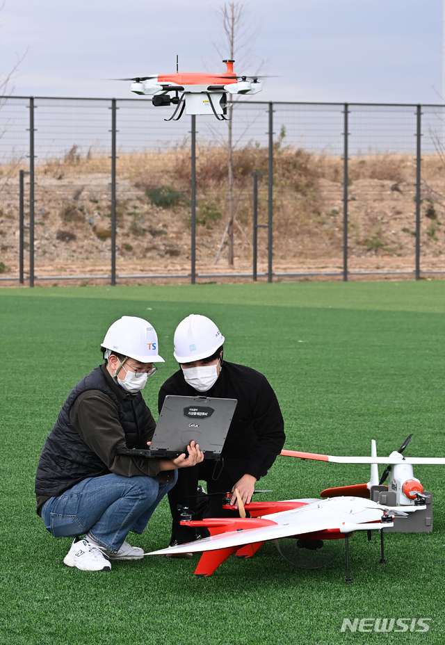 [시흥=뉴시스] 김종택기자 = 9일 경기 시흥시 정왕동 한국교통안전공단 드론 교육훈련센터에서 관계자들이 드론을 비행하며 점검하고 있다. 이날 본격적인 운영에 들어간 훈련센터는 분야별 드론 기체와 영상처리 시스템뿐만 아니라 임무특화 교육을 위한 터널·교량 점검 훈련시설과 분야별 훈련 시뮬레이터도 구비하는 등 다양한 형태의 교육이 가능하도록 구축됐다. 2020.11.09.