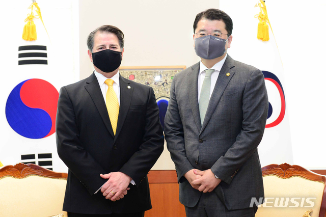 [서울=뉴시스]김명원 기자 = 최종건 외교부 제1차관 29일 오전 서울 종로구 외교부에서 알레한드로 로드리게스 사모라(Alejandro Rodriguez Zamora) 신임 주한코스타리카대사를 접견하고, 코로나19 이후 시대 양국 간 실질협력 및 한-중미 지역협력 강화를 위한 폭넓은 의견 교환했다. (사진=외교부 제공) 2021.01.29. [email protected]