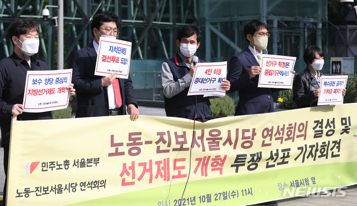 [서울=뉴시스] 조수정 기자 = 민주노총 서울본부와 서울지역 5개 진보정당(노동당 서울시당, 서울녹색당, 사회변혁노동자당 서울시당, 정의당 서울시당, 진보당 서울시당) 대표자들이 27일 오전 서울시청 앞에서 노동-진보서울시당 연석회의 결성 및 선거제도 개혁 투쟁 선포 기자회견을 하고 있다. 2021.10.27. [email protected]