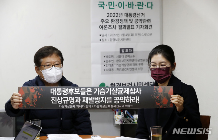 [서울=뉴시스] 홍효식 기자 = 4일 오전 서울 종로구 환경보건시민센터에서 열린 2022년 대통령선거 주요 환경정책 및 공약 관련 여론조사 결과 발표 기자회견에서 김태종(왼쪽) 가습기살균제 피해 유족과 손수연 환경보건시민센터 운영위원이 대선 후보들의 가습기살균제참사 진상규명과 재발방지 공약을 촉구하는 메시지를 보이고 있다. 2022.01.04. [email protected]