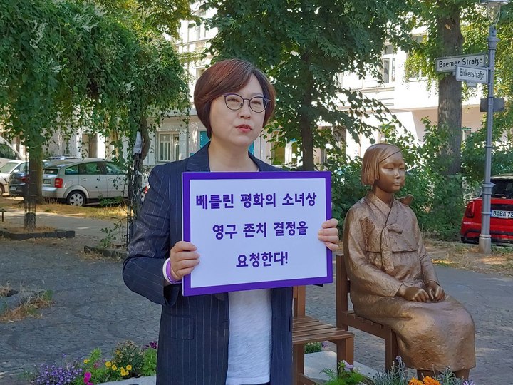 [서울=뉴시스] 조수정 기자 = 이나영 정의기억연대 이사장과 한정화 독일 코리아협의회 대표는 베를린 소녀상 영구존치를 바라는 일본군 ‘위안부‘ 피해자 이용수 할머니의 손편지와 전 세계 시민 31,317명과 국내외 559개 단체의 서명, 그리고 성명서를 5일(현지시간) 레믈링어 독일 베를린 미테구청 담당관에게 직접 전달했다. 레믈링어 담당관은 소녀상 문제가 한일 갈등 양상으로 비춰진 측면이 있지만 이는 전 세계 전시 성폭력을 종식하는 매우 중요한 문제이자 인류보편의 문제라는 점을 강조하면서 영구존치에 대해 긍정적으로 답했다. 특히 고령으로 직접 베를린을 방문하지 못했지만 영구존치를 간절히 소망하며 베를린 시민들에게 감사의 뜻을 전달한 이용수 할머니에게 안부를 전했다. 사진은 베를링 소녀상 앞에서 피켓팅하는 이나영 이사장. (사진=정의기억연대 제공) 2022.07.05. [email protected]