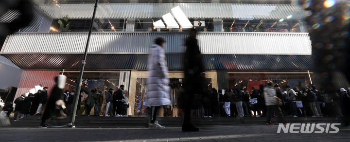 [서울=뉴시스] 백동현 기자 = '아디다스 브랜드 플래그십 서울' 오픈 첫날인 18일 오후 중구 명동에서 고객들이 입장을 대기하고 있다. 전날 아디다스코리아에 따르면 이날 오픈하는 아디다스 브랜드 플래그십 서울은 스포츠 퍼포먼스와 오리지널스, Y-3 등 아디다스의 모든 브랜드를 만나볼 수 있는 국내 유일한 매장이며, '홈 오브 스포츠' 콘셉트로 만든 아시아권 최초 매장이라고 밝혔다. 2023.01.18. [email protected]