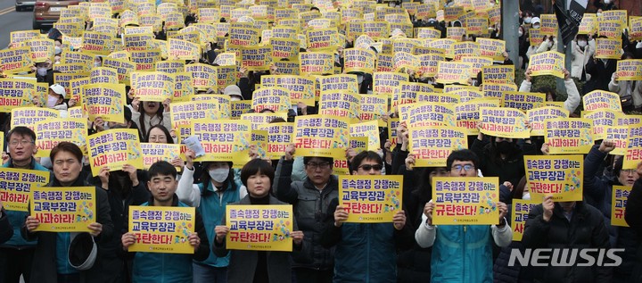 [서울=뉴시스] 김선웅 기자 = 전국교직원노동조합과 유치원 교사들이 12일 서울 용산구 대통령실 인근에서 전국교사결의대회를 열고 정부의 유보통합 전면 철회 및 유치원 공공성 강화, 유아 만 5세 의무교육 실시, 방과후 과정과 돌봄 인력 및 예산 확대, 사립 유치원 회계 투명성 강화, 연령별 기관 일원화 등을 촉구하고 있다. 2023.02.12. [email protected]