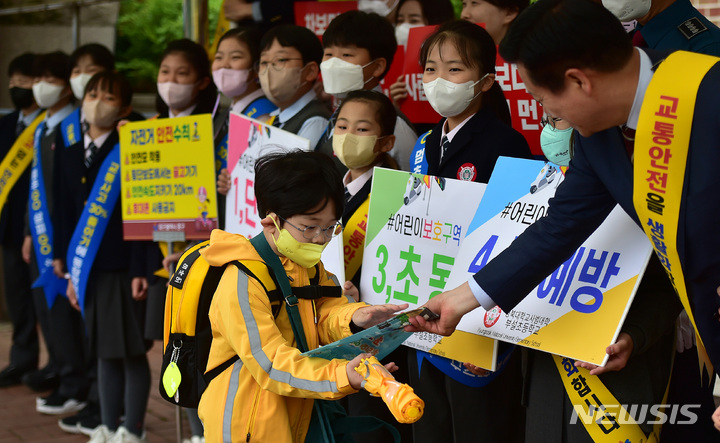 [대구=뉴시스] 이무열 기자 = 18일 오전 대구 중구 경북대사범대학부설초등학교에서 열린 ‘어린이 교통안전 캠페인’에서 류규하 중구청장을 비롯해 중부경찰서 및 녹색어머니회, 전교어린이회장단 등 40여 명이 참석해 어린이 교통안전 지도 및 교통사고 예방 수칙 홍보 등 안전한 교통문화 확산을 위한 캠페인을 벌이고 있다. 2023.04.18. [email protected]