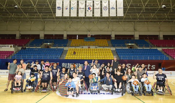 [서울=뉴시스] 조성봉 기자= 15일 오후 춘천 호반체육관에서 열린 '2023 KWBL 휠체어농구리그' 제주 삼다수와 춘천 타이거즈 경기 후 상상인 그룹에서 진행하는 휠체어 지원사업인 ‘휠체어 사용 아동 이동성 향상 프로젝트’로 휠체어 아동 무상 지원(전국 6세~18세)을 받은 가족들을 경기장 초청을 하는 행사를 가졌다. 춘천타이거즈와 최욱철 KWBL총재, 육동한 춘천시장이 함께했다.(사진=한국휠체어농구연맹 제공) 2023.07.15. [email protected]