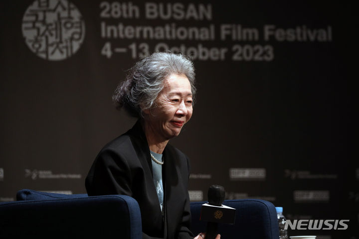 [부산=뉴시스] 박진희 기자 = 윤여정 배우가 6일 부산 해운대구 KNN 시어터에서 제28회 부산국제영화제 '액터스 하우스' 행사를 하고 있다. '액터스 하우스'는 연기력과 스타성을 겸비한 동시대 대표 배우들이 자신의 연기와 작품에 관하여 솔직하고 깊이 있는 이야기를 나누는 유료 행사이며, 수익금 전액은 어린이 구호 활동 기구 ‘세이브 더 칠드런’에 기부된다. 2023.10.06. [email protected]