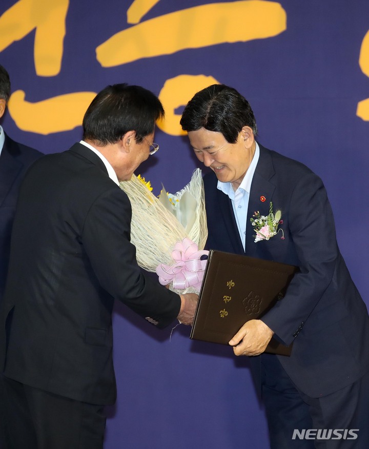 당선 축하 꽃다발 받는 김광수 제주도교육감