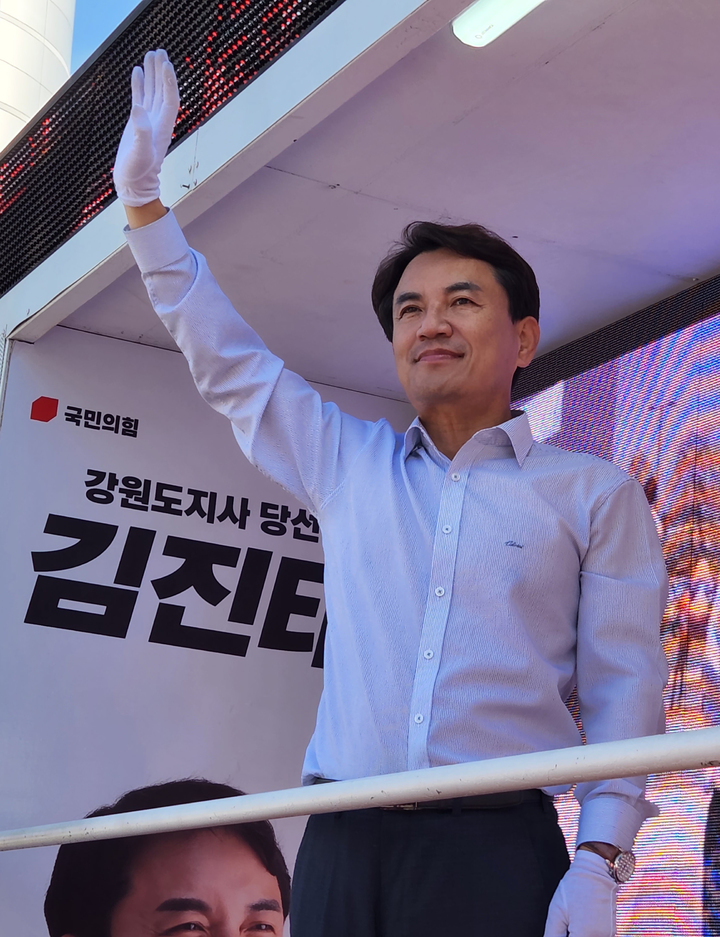 "감사합니다" 당선 인사하는 김진태 강원지사 당선인
