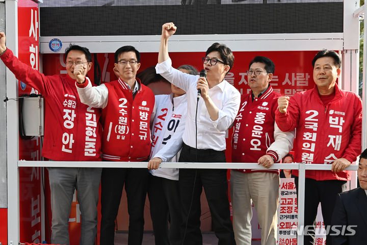 한 위원장은 앞서 서울 중랑구 우림시장 지원유세에서도 "한병도라는 민주당 선거 관련자가 이렇게 말했다. 경기도 판세에 별다른 영향이 없더라"며 "그러니까 김준혁이든 양문석이든 밀어붙인다는 이야기"라고 날을 세웠다.