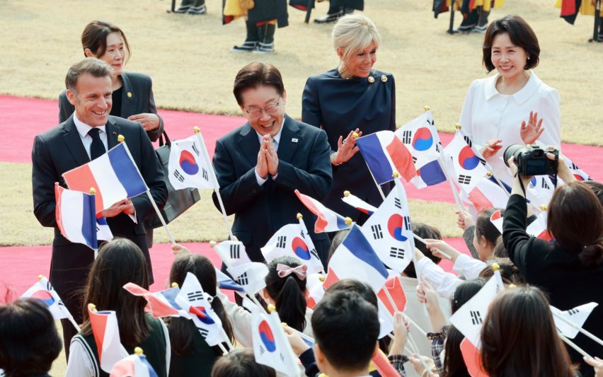 이재명 대통령과 에마뉘엘 마크롱 프랑스 대통령 간 정상회담이 3일 시작됐다. 이 대통령은 이날 오전 10시 청와대 본관 앞에서 열린 마크롱 대통령의 국빈 방한 공식 환영식에 참석했다. 이날 이 대통령은 프랑스 국기 색깔을 상징하는 붉은색과 흰색 그리고 파란색이 섞인 넥타이를 착용했다. 부인 김혜경 여사는 흰색 투피스 차림이었다. 마크롱 대통령이 탑승한 차량은 아리랑을 연주하는 전통취타대와 전통 기수대 70여 명의 호위를 받으며 대정원으로 입장했다. 프랑스 국기를 단 차량이 청와대 본관 정문에 도착하자 이 대통령 부부는 직접 차량까지 마중 나갔다. 마크롱 대통령이 차에서 내리자 두 정상은 악수하고 포옹했다. 이 대통령은 브리지트 마크롱 여사와도 악수하며 환영했다. 두 정상은 서로 팔을 두드리며 친근함을 표시했고, 이 대통령은 짧은 대화를 마친 뒤 마크롱 대통령의 어깨를 감싸며 의장대 사열 경로로 안내했다. 이어 두 정상은 의장대를 사열했고 프랑스 국가와 애국가가 차례로 연주됐다. 국가 연주 후 양국 국기를 든 어린이 환영단이 마크롱 대통령 부부를 맞이하자 마크롱 대통령은 손키스를 보내며 감사를 표했다. 마크롱 대통령 부부를 맞이한 어린이 환영단 30명 가운데는 프랑스 어린이 7명도 있었다. 이후 두 정상은 우리 정부와 프랑스 정부 대표단과 차례로 인사를 교환했다. 이 대통령과 마크롱 대통령은 어린이 환영단에 손을 흔들어 화답한 뒤 정상회담을 위해 청와대 본관으로 입장했다. 두 정상은 방명록에 함께 서명한 뒤 소인수 회담과 확대 회담을 연이어 가질 예정이다. 교역과 투자, 인공지능, 퀀텀, 우주, 원자력, 교육·문화, 인적 교류 등 여러 분야의 협력 강화 방안을 논의하고 관련 조약과 양해각서를 체결할 계획이다. 양국은 이번 정상회담을 계기로 두 나라 관계를 '글로벌 전략적 동반자'로 격상한다. 2004년 '21세기 포괄적 동반자' 관계 수립 이후 22년 만이다.