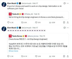 일론 머스크 테슬라 최고경영자(CEO)가 테슬라코리아의 채용 공고를 직접 공유하며 한국 반도체 인재 확보에 나섰다. 인공지능(AI) 칩 경쟁이 격화하는 가운데 한국 인재를 통해 설계와 생산 역량을 강화하려는 행보로 해석된다. 18일 업계에 따르면 머스크 CEO는 17일(현지시간) 테슬라코리아의 AI 칩 디자인 엔지니어 채용 공고를 자신의 소