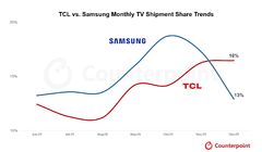 중국 TCL이 글로벌 TV 시장에서 삼성전자를 제치고 1위에 올랐다. 19일 시장조사업체 카운터포인트리서치에 따르면 지난해 12월 기준 TCL의 글로벌 출하량 점유율은 16%로, 삼성전자를 제치고 1위를 차지했다. TCL은 아시아·태평양, 중국, 중동, 아프리카 지역에서 큰 폭의 출하를 기록한 것으로 분석됐다. 이에 따라 TCL의 TV 출하량