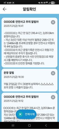 운항 시간과 운항 거리가 위험 임계치를 넘긴 5t 이상 어선을 대상으로 해양교통안전정보시스템(MTIS) 앱에서 '안전사고 주의 알림' 서비스가 시작된다. 한국해양교통안전공단(KOMSA·이사장 김준석)은 어선 운항 빅데이터를 분석해 도출한 운항패턴 기반 위험 기준을 바탕으로, 이를 초과한 선박을 자동 식별해 맞춤형 안전 주의 알림을 제공하는 모바일