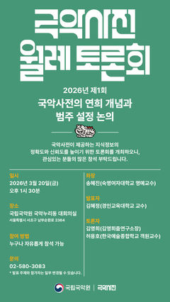 국립국악원은 오는 20일 오후 1시 30분, 국립국악원 국악누리동 대회의실에서 '2026년 제1회 국악사전 월례 토론회'를 개최한다. 이번 토론회는 '국악사전의 연희 개념과 범주'를 주제로 논의하고, 국악사전 내 악(樂)·가(歌)·무(舞)·희(戱)의 범주를 검토·정리하는 자리다. 국악사전은 한국 전통음악과 전통춤에 관한 정확하고 상세한 이해