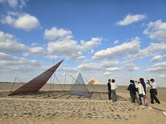 이집트 기자 사막에 피라미드가 두 겹으로 서 있다. 뒤로는 7000년 전 석조 피라미드가, 앞으로는 빨강·노랑·파랑 3원색 구조물이 또 다른 피라미드의 윤곽을 그린다. 사각 프레임 안 삼각 구조물이 사막의 수평선을 가르고, 바닥에 박힌 아크릴 미러 조각은 돌처럼 빛을 튀긴다. 한국 작가 박종규의 신작 대지미술 ‘영원의 코드(Code of the Eter