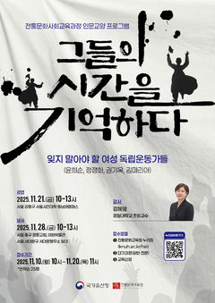 올해 광복 80주년을 맞아 일제강점기 일제에 맞서 싸운 여성 독립운동가들의 삶을 되새기는 강연이 마련된다. 국가유산청 한국전통문화대학교 전통문화교육원 오는 21일과 28일 2025년도 인문교양프로그램 '그들의 시간을 기억하다 - 잊지 말아야 할 여성 독립운동가들'을 운영한다고 7일 밝혔다. 이번 프로그램은 전통문화교육
