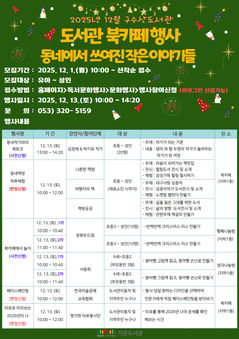 대구 행복북구문화재단 구수산도서관은 연말을 맞아 '동네에서 쓰여진 작은이야기들' 북카페 행사를 연다고 3일 밝혔다. 프로그램에는 3개의 동네서점(책방공공, 여행자의 책, 나른한 책방)이 참여한다. 각 서점은 오는 13일부터 도서 전시와 글쓰기와 필사하기 등 주제 관련 체험 행사를 진행한다. 이 외에도 ▲12월의 지역작가 강연 ▲결혼이주여성들