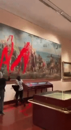 스페인의 한 박물관에서 크리스토퍼 콜롬버스를 기리는 벽화에 붉은 페인트가 뿌려지는 사건이 벌어졌다. 환경운동을 이유로 벌어진 이번 시위는 문화유산 훼손 논란으로 번지고 있다. 13일(현지시간) 뉴욕포스트, 스페인 엘 파이스 등에 따르면, 지난 12일 스페인 마드리드 해군 박물관에서 환경단체 소속 활동가 2명이 전시 중인 회화 작품 '콜