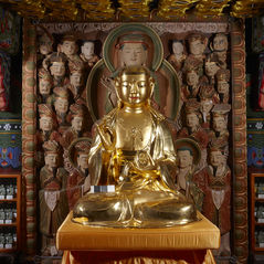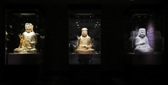 전라북도 불교 중심지 고창 선운사 지장보살좌상들이 지장보궁 금동지장보살좌상을 중심으로 한자리에 모여 앉았다. 20일 서울 불교중앙박물관에서 열린 특별전 '도솔산 선운사-선(禪)에 들고 구름에 눕다' 언론 공개회에 보물 지장보궁 금동지장보살좌상 왼쪽에 '도솔암 내원궁 금동지장보살좌상'이, 오른쪽에 '참당암 석조지장보살좌상'이 함께 공개됐다. 불