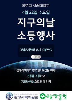 천주교 서울대교구가 '지구의 날'을 맞아 소등 행사에 동참한다. 서울대교구 환경사목위원회가 22일 수요일 저녁 8시부터 10분간 교구 내 모든 본당과 기관, 수도회, 사도직 단체 및 신자 가정을 대상으로 일제 소등 행사를 실시한다고 16일 밝혔다. 이번 행사는 서울대교구가 전국적으로 진행되는 지구의 날 캠페인에 발맞춰 신앙 안에서 '공동의
