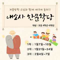 겨울방학을 맞아 초등학생을 대상으로 하는 템플스테이가 부안 내소사에서 열린다. 대한불교조계종 내소사는 초등학생 4~6학년을 대상으로 3박 4일 '내소사 한문학' 특별 템플스테이를 3회에 걸쳐 진행한다고 밝혔다. '내소사 한문학당'은 한자자격증 초급 수준 학습을 중심으로 게임과 퀴즈 등 놀이 요소를 결합해 흥