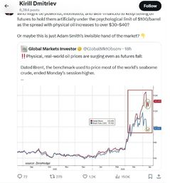 키릴 드미트리예프 러시아 대통령 대외 투자·경제 협력 부문 특별 대표 겸 러시아직접투자펀드(RDIF) 최고경영자(CEO)는 14일(현지시간) "국제 유가가 배럴당 100달러 아래로 인위적으로 억제되고 있다"고 주장했다. 드미트리예프는 이날 소셜미디어 엑스(X·옛 트위터)에 '선물 가격이 하락함에도 원유 실물은 급등하고 있다'는